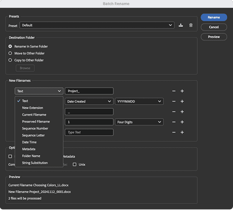 Adobe Bridge makes it easy to rename hundreds of files at once with a consistent naming system. You can include custom text, numbering, dates, or metadata fields in your new names. This is especially helpful when preparing deliverables for clients, uploading files, or organizing archives.