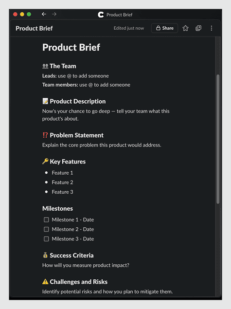 Slack now includes a feature called Canvas. It’s essentially a wiki-style document editor that anyone can update, and it lives inside a channel. Unlike Google docs, canvases don’t get lost behind 50 links and a cluster of permission configurations. They’re right there where you need them. Use these for: