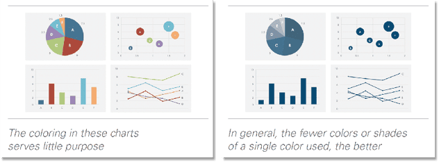 When designing charts in PowerPoint, do not use color decoratively, but rather use it deliberately and to help communicate your data and story. More often than not, multicolored charts distract the eye and serve no purpose other than needless decoration. Use grays or monochromatic schemes whenever possible.