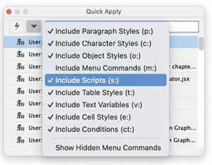 For my money, the fastest, easiest way to run scripts in InDesign is to use Quick Apply. There’s just one bit of set up you have to do first. By default, Scripts are turned off in Quick Apply, so you have to open the dialog box by pressing Command+Return/Ctrl+Enter. In the drop-down menu, choose Scripts.