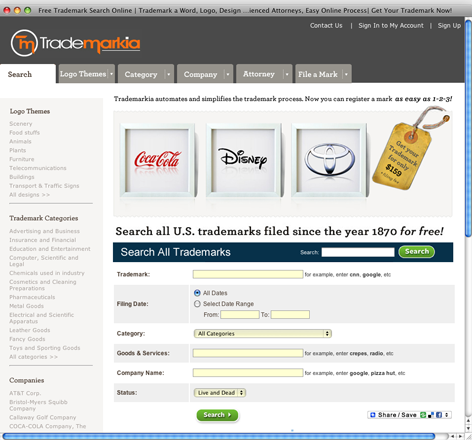Trademarkia provides detailed visibility into expired and abandoned business names, slogans, and logos; proactively alerting users about upcoming issues, counterfeit marks; and offering personalized suggestions for interesting brands. The service is accessible via the Web or cell phone. And it’s safe and secure; Trademarkia is updated every day with fresh data, and offers secondary checking services to users.