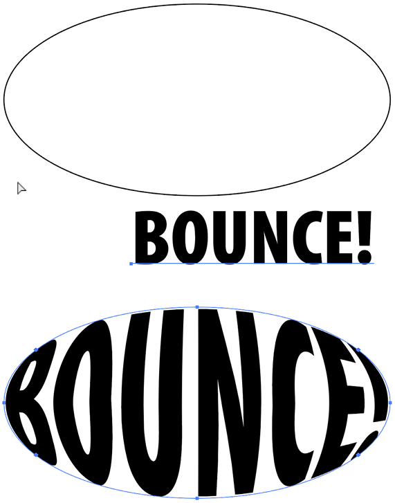 The third option for using Envelope Distort is useful but should be used sparingly… much like the font Giddyup or Cooper Black! It’s the Make with Top Object feature, and to understand how it works, you must first know that items placed on your artboard are “stacked” in the order they were added. So if you draw an oval, then type the word BOUNCE, and then select them both and choose Object > Envelope Distort > Make with Top Object, you’ll get an error message instead of a cool effect, because the text is the top object. To fix this, just select the oval and choose Object > Arrange > Bring to Front to move the shape in front of the text. Now, with both items selected, you can choose the Make with Top Object command, or use the keyboard shortcut Command+Option+C (Mac) or Ctrl+Alt+C (Windows) and your text will warp to fill the shape (Figure 9).