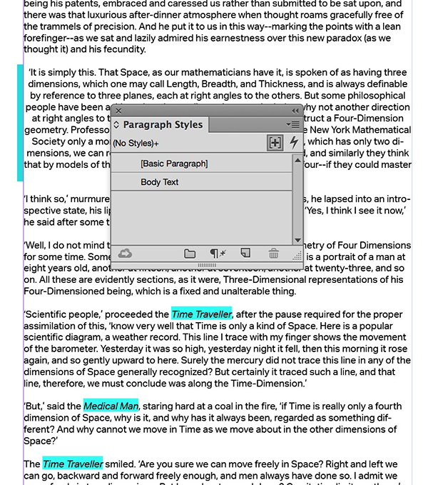 The Styles Override Highlighter is off by default, but to toggle the feature on, click the tiny plus sign in the upper right corner of your Paragraph Styles panel. If you’re not using styles (I’ll pretend not to hear that), then you won’t see any change. And if you’re very good at using styles and have no overrides, you also won’t see any indication of this feature in action. Unlike the now-unnecessary script, you can tell if the highlighting is active as the toggle becomes “pressed in” when active. So far I love this feature, so I’ve set it to be on with no document open, so that every new document I create will be ready to reveal any lurking overrides.