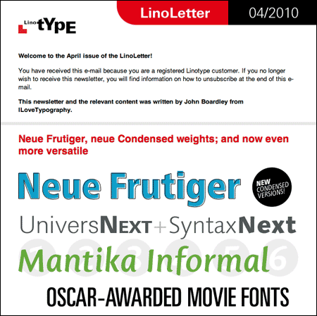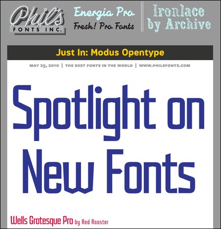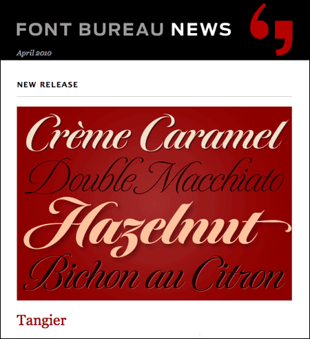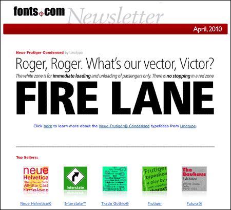 There’s no enticing name for this enewsletter, but the contents are anything but bland. The Fonts.com enewsletter contains showings of their latest font releases; links to the top-selling fonts and featured foundries; the fy(t)i column (written by yours truly); and other informative typographic articles.