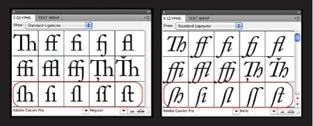 Many historically inspired OpenType fonts, such as Caslon, Bodoni, and Garamond, contain a wide assortment of ligatures, some of which look like an f ligature without the right side of the crossbar. These are actually long s ligatures that were commonly used for sl, sh, si, st and ss combinations centuries ago. If you mistakenly use these as f ligatures, you’ll misspell every word they’re in.