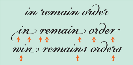 For instance, some swash characters are intended for either the beginning or end of a word to avoid crashing into other letters and/or creating too much space between two characters. When this feature (Swash or Contextual Alternates) is turned on in a supporting application, such as InDesign or QuarkXPress, the software automatically inserts the correct swash. If the text changes, the application automatically changes the swash character back to the standard one as necessary.