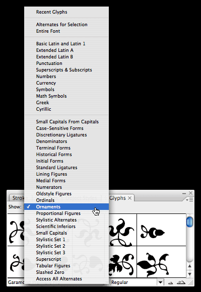 Figure 1. Adobe Garamond Premiere Pro contains ornaments that you can view from the glyph palette subset entitled “Ornaments.” As you can see, many other character subsets are also accessible from this pull-down menu.