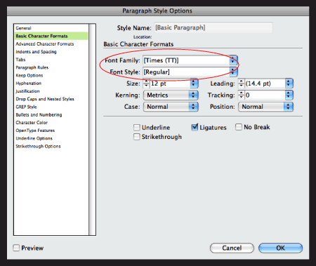2. This opens the Paragraph Style Options dialog box. Select and click on Basic Character Formats from the menu on the left.