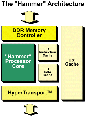 Figure 2: AMD marketing (and engineering) seem to believe in repurposing designs. This old diagram of the "Hammer" architecture is exactly the same as the one found in their Opteron literature, expect that the word "Hammer" is replaced by Opteron, without quote marks. Note the HyperTransport layer at the bottom. This technology is offered royalty free through the HyperTransport Consortium and is already supported on some graphics cards.