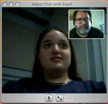 Figure 1: Apple’s new high-quality webcam is called the iSight. Here you can see a screen shot of a virtual face-to-face meeting with someone over the Internet. I see the larger image of the person on the other end as well as a thumbnail image from my camera. Of course, the quality of the image depends on the bandwidth available, the performance of the camera and the processing power of the computer. And it’s no video conferencing system; Apple is pitching it for one-to-one chats. Meanwhile, I’m dressing up more at the home office — meaning that my shirt has sleeves!