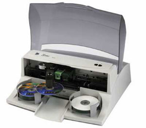 Figure 4: For those tired of swapping discs in and out of drives and labeling packages, Primera’s Bravo Disc Publisher places an optical drive, robotics assembly and an 2,400-dpi four-color inkjet printer in a single box.