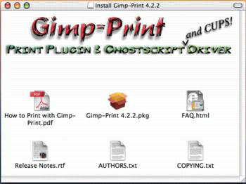 Figure 3: Here’s the open window of the Gimp-Print installer. They’ve done some interesting coding to the window so that it shows their logotype. In addition to the .pkg file (the box icon), the software comes with a FAQ and a set of detailed instructions. Please read the manual this time!