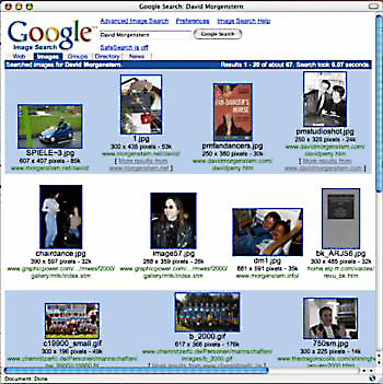 For example, when I performed a Google image search for “David Morgenstern,” I was presented with several pages of photos and even letterhead (see Figure 1). I thought that photos of me from my personal web site would come up first — no way! There were snapshots of other David Morgensterns, mostly kids; some shots from a Macworld tradeshow party (but not of me); and even one of Bill Macy portraying a character on the television show ER. In this first set of images there were several images from my Perry Mason Picture Pages but pictures of me fell below the fold.