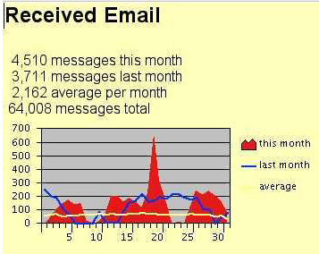 Figure 1: Eudora’s statistics page tracks your mail usage in a variety of ways, including how long you spend reading and sending messages. Here’s a view of a month’s receipt of messages, showing how the rate declines over each weekend and rises during the work week. And then there’s the recent spike in the middle of the month from the release of SoBig and Blaster worms.