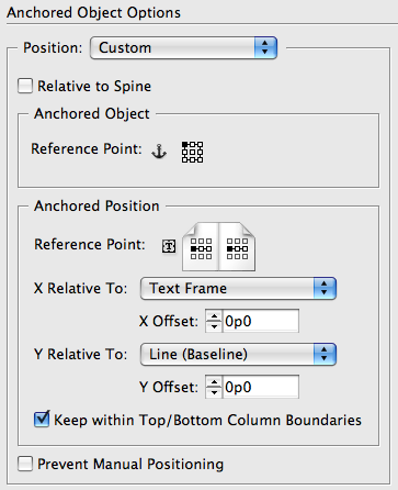 Then I selected all those lines (I dragged a marquee around them with the Selection tool, then Shift-clicked the frame itself to deselect it), then grouped them (Object > Group). At this point, I created an object style for this group, which makes it easy to change it in the future. Then I anchored it into the paragraph (cut with Selection tool and pasted into the first line of the paragraph with the Type tool). Here’s the Anchored Options pane of the Object Styles dialog box:
