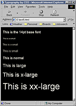 Finally, as we mentioned, there are two ways to refer to relative sizes through keywords. The first set of keywords is xx-small, x-small, small, normal, large, x-large and xx-large. Figure B shows these seven sizes based around a 14-point font. In this set, normal refers to the last specified font-size and all other sizes are relative to that. Strangely enough, NS 6+ renders large as slightly smaller than normal and x-small only the slightest bit larger than xx-small. In IE 5+ and Opera 5+ the differences are more pronounced.
