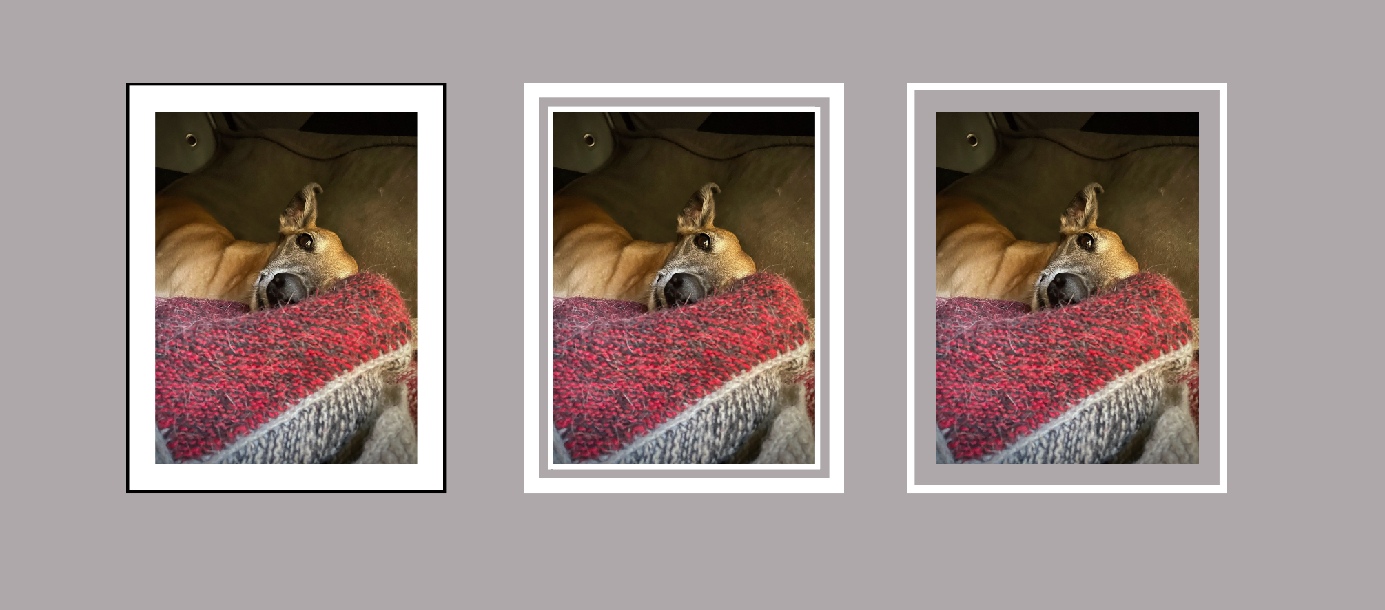 What I would like to achieve is the first image on my example below, with the ability to have a thick padding coloured border around the image, and a another thinner one in another color, without having to stack multiple frames, and obviously without having to measure for each image to accommodate the size of the padding, etc.