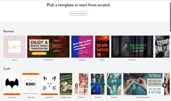 Figure 2: Templates on the iOS version of Adobe Spark Post (above), and the web version (below).