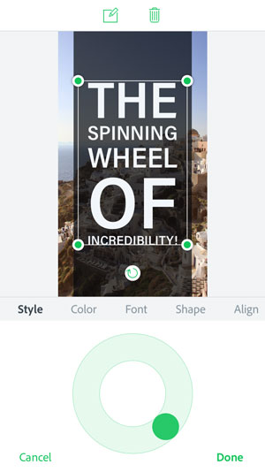Giving this little orb a spin cycles your text through shapes, fonts, alignment, and color (within the palette you’ve chosen). If you’ve been designing all day and really want an app to do the work for you, then give that wheel a spin. Or thirty. Let go and tap Done when you’ve found the perfect design; make more tweaks as needed.