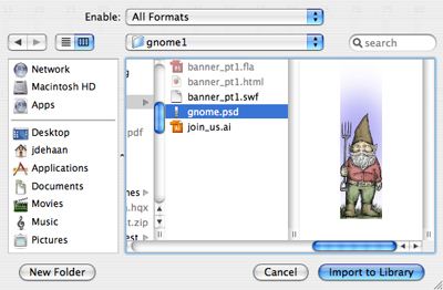 To see how easy it is to import images into Flash, we’ve provided an image of a garden-variety gnome in the tutorial source files. Before you proceed, make sure that you download the sample files at the beginning of this tutorial (if you haven’t done so already) and extract the images to the same folder as your banner.fla document.