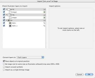 Tip: In some situations, you might want to control how the illustration imports, such as by not importing certain elements of that file. To do so, you can deselect layers or folders that you do not want to import into Flash.