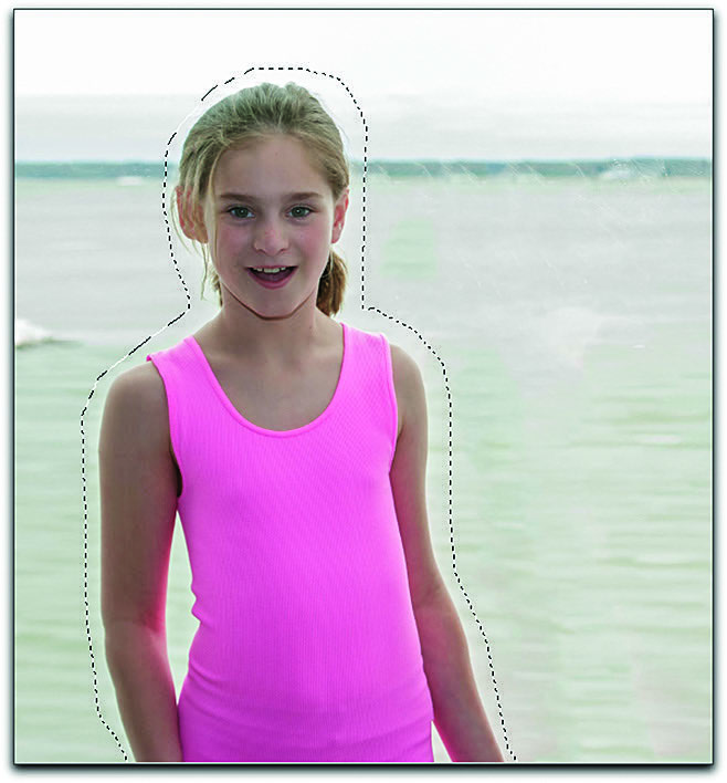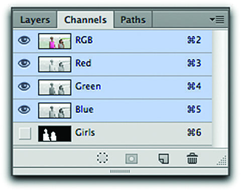 Use the Quick Selection tool to select the girls, including the area between their arms and bodies. With the selection active, choose Select>Save Selection from the Main menu and name it Girls . Look in the Channels panel, and you’ll see your Girls Alpha channel at the bottom. Alpha channels don’t print or alter an image, they are only used to store selections. Now we’re ready to proceed.