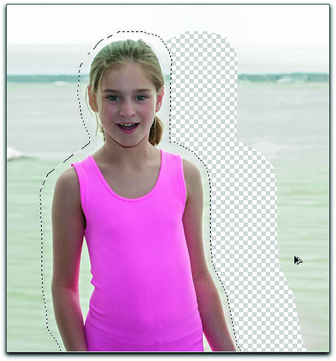 With the selection active, drag the girl to the left and wait a second. Photoshop does some analyzing, then, presto, the hole fills with a manufactured background. In effect, the Content Aware Move tool did three things: move the girl, reselect the hole she vacated, and fill using Content Aware Fill.