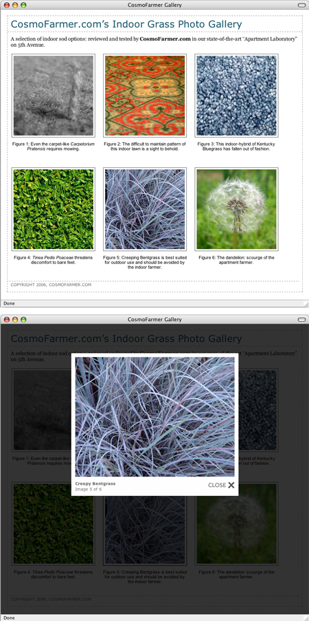 Figure 1. The top screen capture shows the gallery thumbnails. The larger version of the grass photo in the bottom screen capture appears when you click on the Creepy Bentgrass thumbnail.
