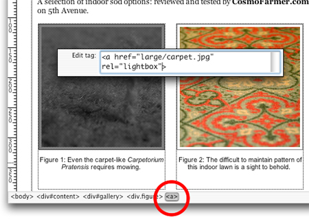 3. In the tag selector at the bottom of the Document window, click the <a> tag to select the link you just added (circled in Figure 3). The tag selector is the most accurate way to select an HTML tag. You just need to add a single attribute to this tag to activate the Lightbox2 function.
