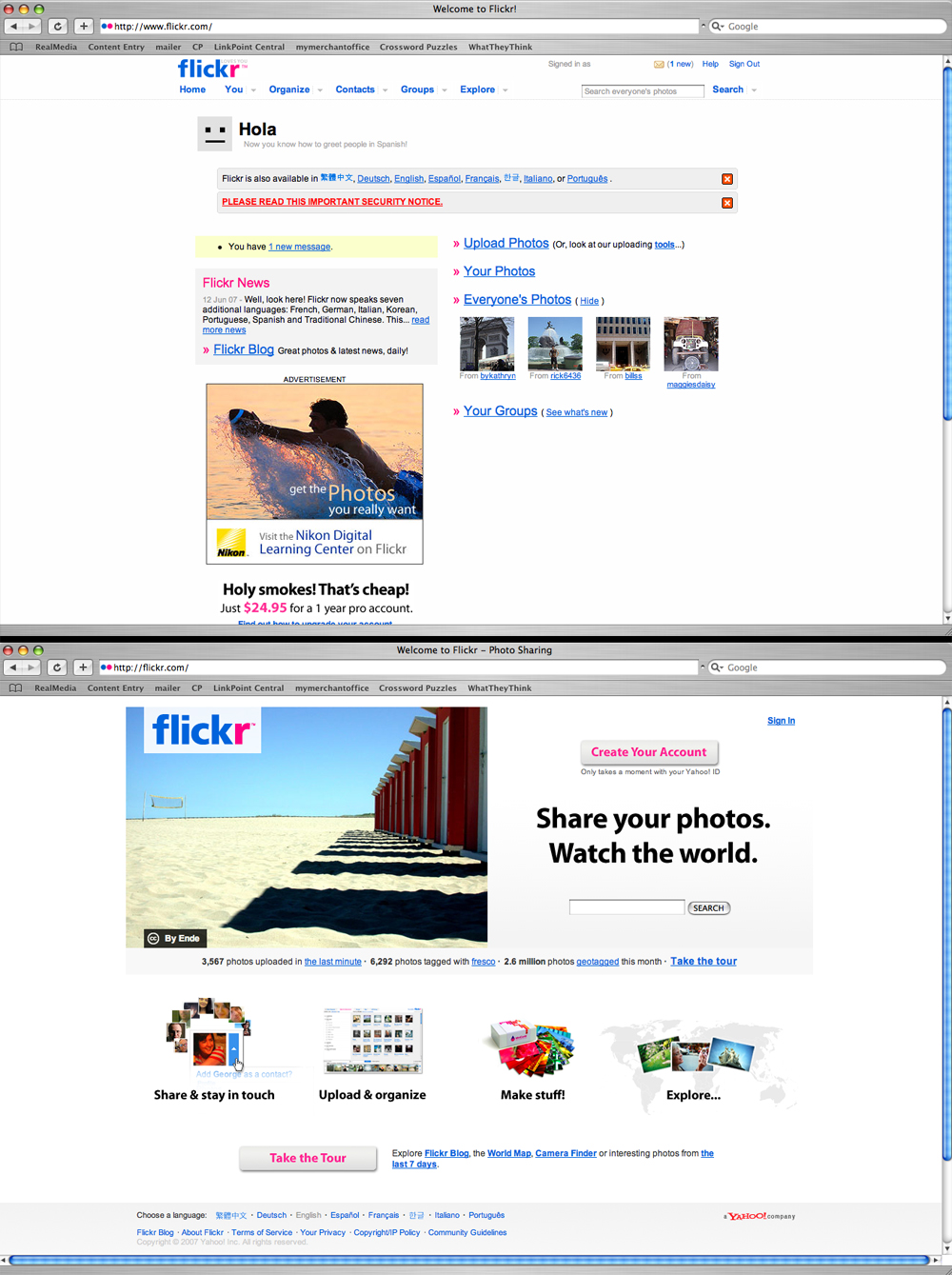 Figure 1. The Flickr home page changes to reflect whether you’re signed in (top) or not (bottom). Click on the image for a larger version.