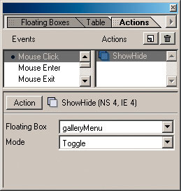 Setting an image as a rollover automatically makes it a link and allows you to define link actions for it. To do so, switch to the Actions palette and you’ll notice that there’s a list of events in the Events section of the palette. We want the pop-up menu to appear when you click the button, so choose mouseClick from the list. Now, just click the New Action button to set the action for that event. Choose Action > Multimedia > Show/Hide in order to set the properties for showing or hiding floating boxes, as shown in figure 12. Choose your box from the pop-up menu and set the Mode to toggle. This way you click once to open the box and once more to close it again. Switch to Preview to see how it works.