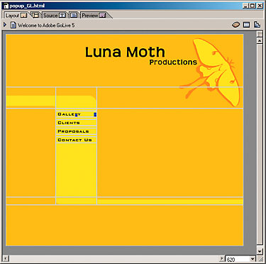We used GoLive to set up a normal Web page. For the majority of the page we created simple tables with images, as you can see in figure 9. Up to this point the page is just your basic HTML page, but we’ll soon change that.