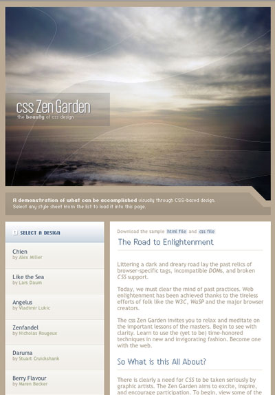 The CSS Zen Garden is a Web site that demonstrates how Cascading Style Sheets (CSS) can be the foundation for powerful, flexible sites. Hundreds of Web designers have taken the Zen Garden code and, varying only the CSS style sheet and the images, made distinctly different sites.