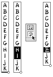 Figure 8: With text direction set to vertical, clicking the Stage with the text tool gives you an insertion point lying on its side (top). As you type, you enter a column of single characters (middle). The text box grows in length to accommodate all the text you enter (right).