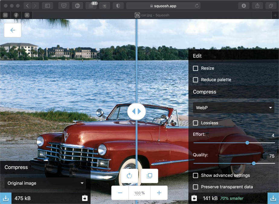 In the car example, which produced a 150kb file using Photoshop’s Save for Web showed a modest reduction to 141kb as a WebP file in Squoosh: