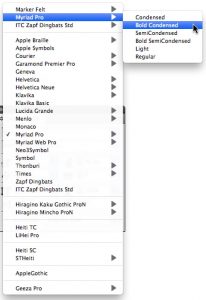 But when I went to try to find Myriad Pro Bold Condensed today, it was missing, and I knew that I had it active on my system (I had just used it in a different file earlier in the day).