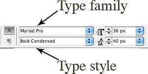 I noticed something else today that I’ve never noticed before: I usually choose an individual type style by using the type “family” field in the Control panel or Character panel. When you use the family field, if the family has multiple styles, you can choose them from a fly-out menu that appears to the right of the family. Type styles that are activated by InDesign don’t appear in this fly-out menu (as seen above). But if you choose your type family from the “family” field, and then move down to the type “style” field below it, all the styles available to you appear in this list, whether they are activated by InDesign or installed on your system!