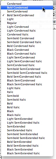 I noticed something else today that I’ve never noticed before: I usually choose an individual type style by using the type “family” field in the Control panel or Character panel. When you use the family field, if the family has multiple styles, you can choose them from a fly-out menu that appears to the right of the family. Type styles that are activated by InDesign don’t appear in this fly-out menu (as seen above). But if you choose your type family from the “family” field, and then move down to the type “style” field below it, all the styles available to you appear in this list, whether they are activated by InDesign or installed on your system!