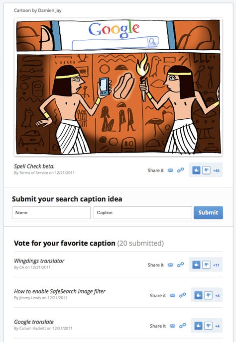Once you submit your caption, you can ask other people to vote for it by sending them a direct link. The caption with the most votes is the first one to appear under the cartoon.