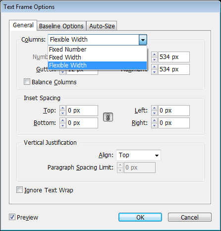 Select the new choice, Flexible Width, and in the new Maximum field underneath the Columns menu, specify the maximum width of a single column you’re willing to live with. Given the fact that my document started out as a two-column layout within half-inch margins on an 8.5-inch-wide page, I’m going to set my maximum column width to 3.5 in, which, considering the presence of the gutter, is a little bigger than what fits on the original version page. When you’re satisfied with your options, click OK.
