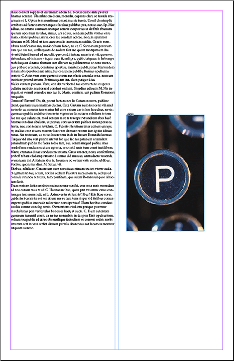 Starting with an identical document, using a primary text frame filled with placeholder text in two columns and the same unanchored image. (If you hadn’t yet noticed, CS6 replaces the notion and behavior of a “master text frame” with a “primary text frame,” something you don’t manually have to override! Wahoo!)
