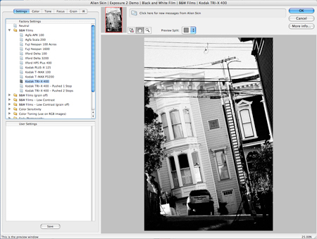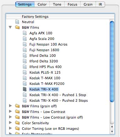 For people with experience choosing particular film stocks to achieve certain looks, the presets provided by both of these products give you a quick way to exploit your film background. But even if you’ve never shot film, these plug-ins are handy for black and white shooting, since they provide high-quality automatic black and white conversions.