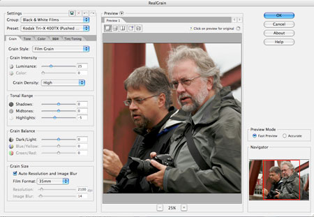 If you’re more familiar with digital photography than film photography, you may not know about grain: visible clumps of silver halide crystals on a piece of film. Different film stocks have their own characteristic clumping that varies in amount and pattern. If you want to stay in the digital realm but still want the look of specific film stocks, two Photoshop plug-ins, Alien Skin Exposure 2 ($249) and Imagenomic’s Real Grain ($99.95), provide easy-to-use tools that let you mimic the tone, color, detail, and grain qualities of particular film stocks.